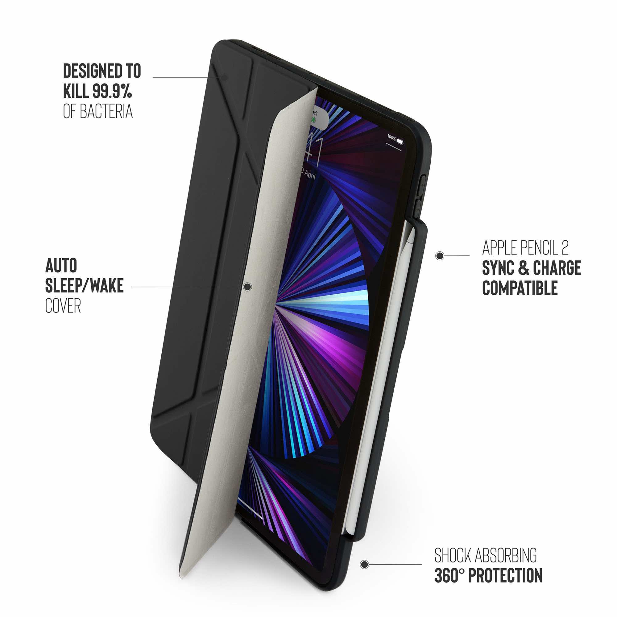 Framhliðin er í fjórum hlutum, sem auðvelt er að rúlla upp og mynda þá stand sem lyftir iPad upp í þægilega stöðu.